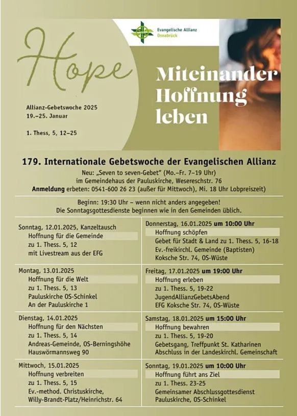 Montag, 13., bis Freitag, 17. Januar: „Seven to seven-Gebet“ (7–19 Uhr) im Gemeindehaus der Pauluskirche, Wesereschstr. 76.