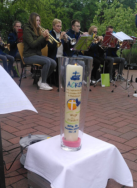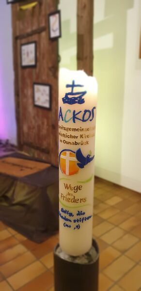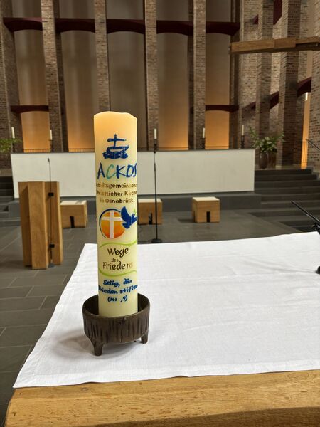 Beim ökumenischen Friedensgottesdienst in der Bergkirche am 25. Oktober 2024, dem Osnabrücker Friedenstag, wurde eine „Ökumenische Friedenskerze“ entzündet. Die Kerze wandert seitdem durch alle christlichen Kirchengemeinden in Osnabrück und spendet im Gottesdienst Licht und Hoffnung als Zeichen für Frieden und Gerechtigkeit.